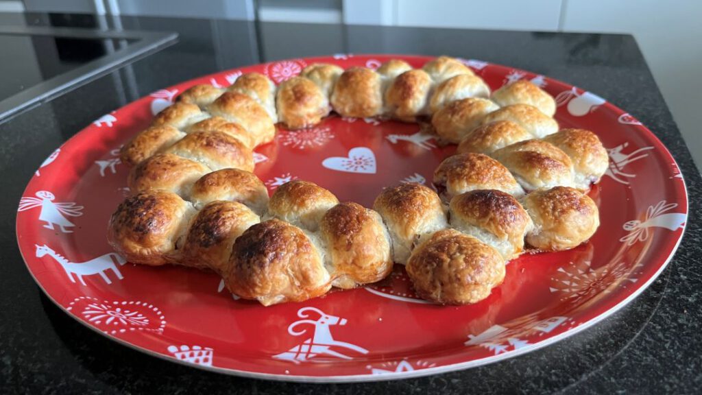Neben Plätzchenteller habe ich für den Weihnachtskaffee auch noch einen gefüllten Blätterteigkranz gebacken.