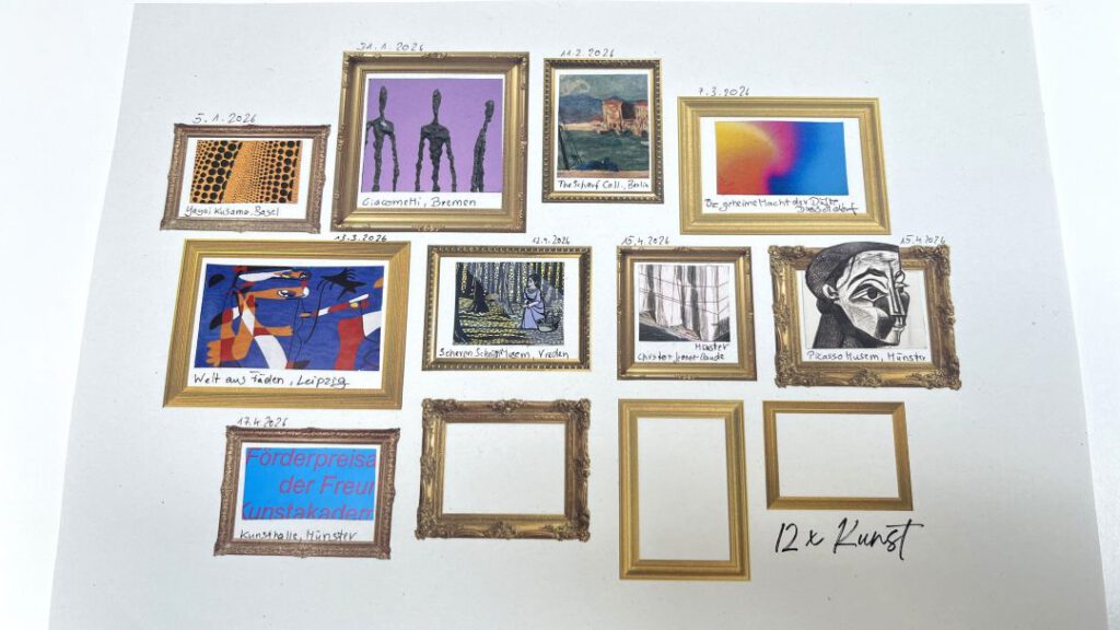 12 Kunst-Ausstellungen in diesem Jahr, das ist der Plan. Ich hatte schon fünf im März zusammen. Jetzt im Urlaub habe ich noch mal vier Ausstellungen gesehen. Ich wollte erst ja nur eine zählen, nach dem Motto, die kleinen kann ich ja nicht mitzählen oder … Aber, ab welcher Größe zähle ich dann oder was fällt weg? Also durften doch alle mit auf mein Challenge-Bild.